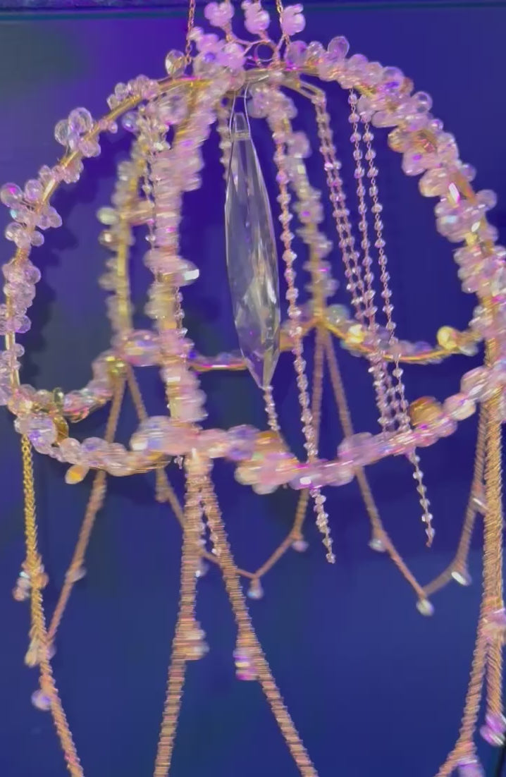 Celestial Halo is a one-of-a-kind LunaLumen creation, handcrafted with intricate gold framing, cascading crystal strands, and a statement prism centrepiece designed to capture and refract light in every direction.